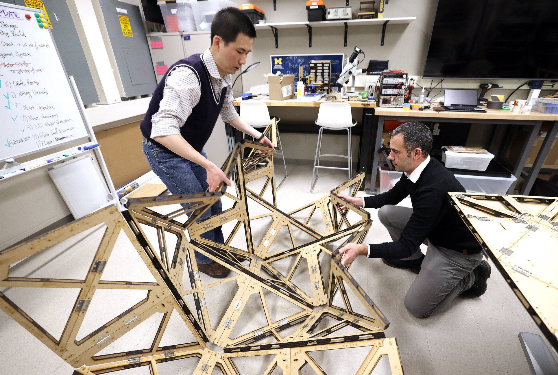 Engineers at the University of Michigan are proving that the concept of origami art can go beyond a hand-held paper crane — far beyond. Scientists published a study earlier this month demonstrating how complex, load-bearing structures like bridges can be built with foldable origami modules. Per a press release from the school, researchers have “struggled for years” to create a successful origami construction system. The key to this team’s success is uniformity, and more specifically, uniform thickness, said first author Yi Zhu. “When people work with origami concepts, they usually start with the idea of thin, paper-folded models — assuming your materials will be paper-thin,” he explained. “However, in order to build common structures like bridges and bus stops using origami, we need mathematical tools that can directly consider thickness during the initial origami design,” he explained, noting that “uniformity of the component’s thickness is what’s key and what’s missing from many current origami systems.” The Michigan system, called the Modular and Uniformly Thick Origami-Inspired Structure system, can create a 13-foot-long walking bridge, a 6.5-foot-tall bus stop, a 13-foot-tall column, and more. Watch a video of the building process.