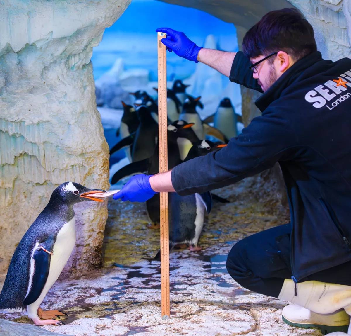 It’s the annual Count & Clean! Each year, staff at Sea Life Aquariums in the U.K. take stock of the more than 30,000 marine creatures living across 11 locations, counting, weighing, and measuring each animal. And it appears that some of the residents, like this Gentoo penguin, require an edible bribe to comply with the initiative.