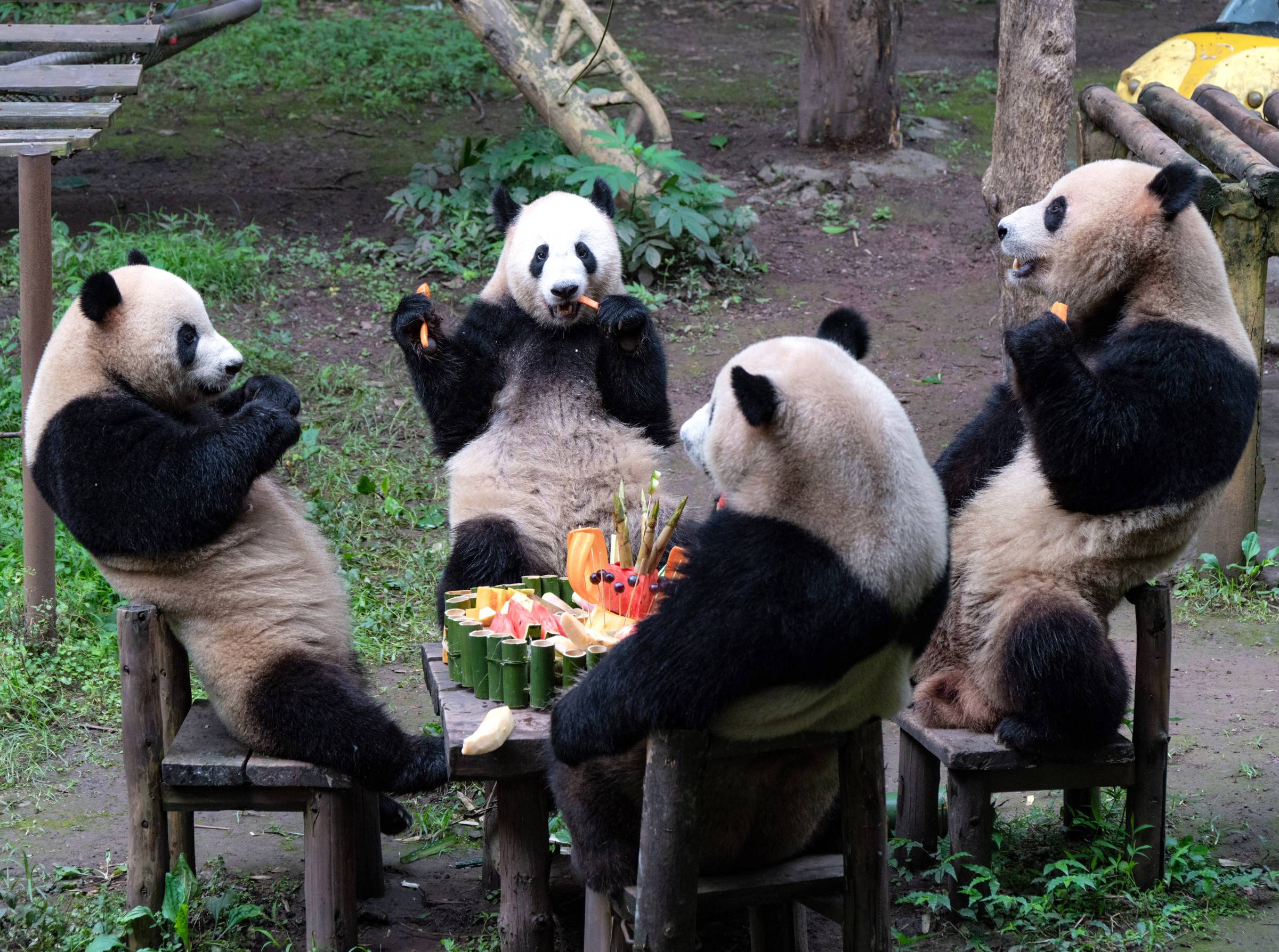 It’s a panda party! Two sets of twin giant pandas recently celebrated their 5th birthdays at China’s Chongqing Zoo, complete with a cake made from bamboo shoots and fruit.
