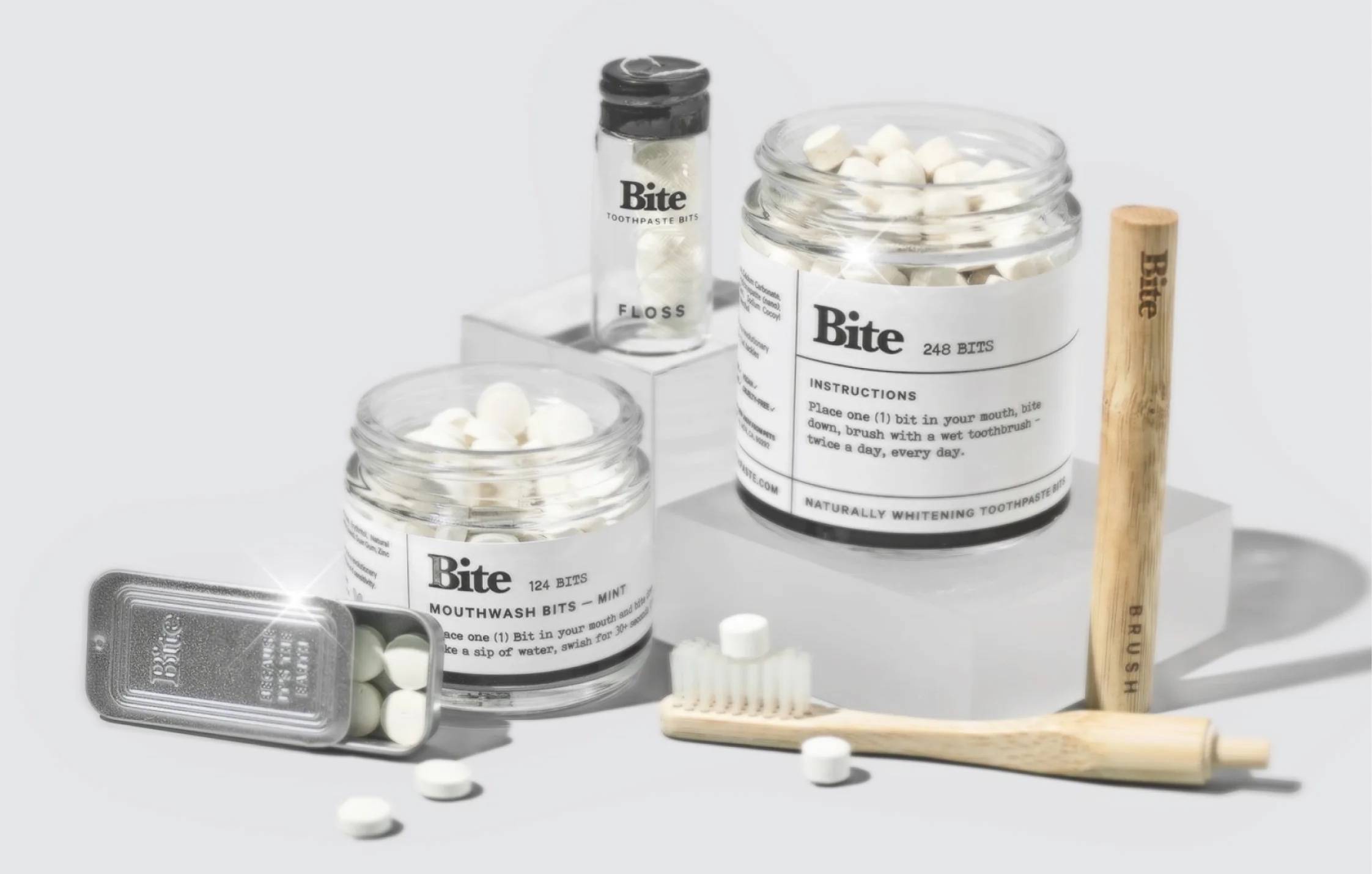 Bite Daily Habits Kit Bite is rethinking dental care products though an eco-friendly lens, replacing the traditional plastic tubes of toothpaste with “bits” that come in a reusable glass jar. The Daily Habits Kit — with a jar of toothpaste bits, jar of mouthwash bits, floss bottle, bamboo toothbrush, and travel tin — has everything you need to go plastic-free and keep those pearly whites clean.