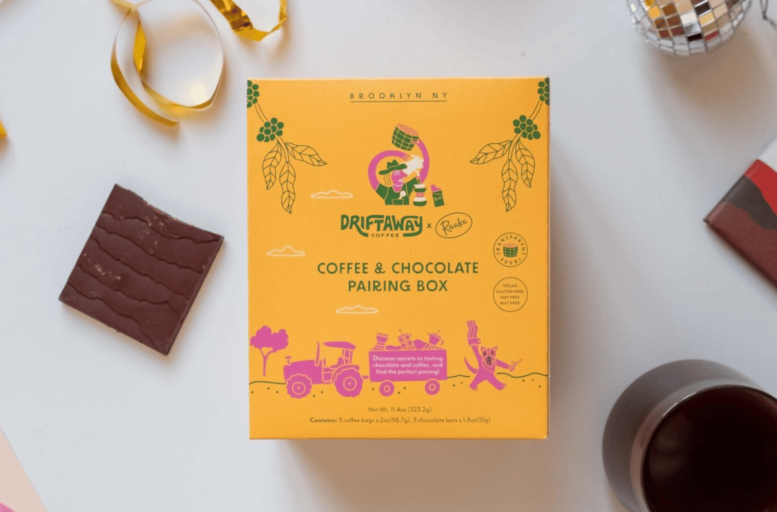 Driftaway Coffee and Chocolate Pairing Box Forget peanut butter and jelly — chocolate and coffee is the real culinary dynamic duo, and Driftaway knows it. The java purveyor’s coffee and chocolate pairing box includes three 2-ounce bags of coffee from around the world, three single-origin bars from Raaka Chocolate, and a tasting and pairing guide to help you explore the flavors and richness of your treats.