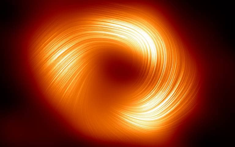 Now that’s a swirl. This new image from the Event Horizon Telescope Collaboration reveals the spiraling magnetic field surrounding the supermassive black hole at the center of the Milky Way. Read about why it’s significant.