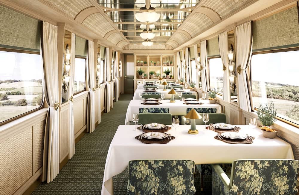 A new luxury sleeper train by Belmond is headed to England next summer, the first for the country where rail travel originated. Called the Britannic Explorer, it will depart from London on a trio of picturesque routes — though passengers may find that their interior surroundings rival the beauty outside their windows. Three of the train’s 18 cabins are grand suites that carry a price tag of around $17,700 a person. They’re designed to reflect the beauty of “an English country garden,” per the website, and include private butler service, in-room dining, and marble furnishings. Lower-cost accommodations, at about $7,300, have been decorated to embody Britain’s azure coastline and rolling green hills. The botanically themed restaurant cars are inspired by potting sheds and wildflower meadows, and will feature farm-to-table fine dining, with menus curated by renowned chef Simon Rogan. Altogether, the train has the effect of a “moving painting,” Ottavia Palomba, global head of brand communications at Belmond, told CNN. Also on board is a wellness suite, where passengers can enjoy spa treatments during their three-night journeys, and an expert-led yoga class that early risers can attend. Off-train excursions include private wine tastings, wild swimming, and art exhibitions. Check out more enchanting photos of the Britannic Explorer.